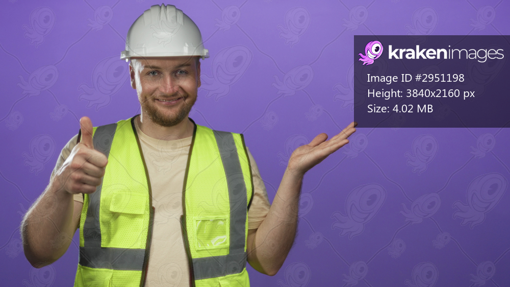 Man in hardhat and high visibility vest giving thumbs up and pointing palm in purple studio; confidence teamwork.