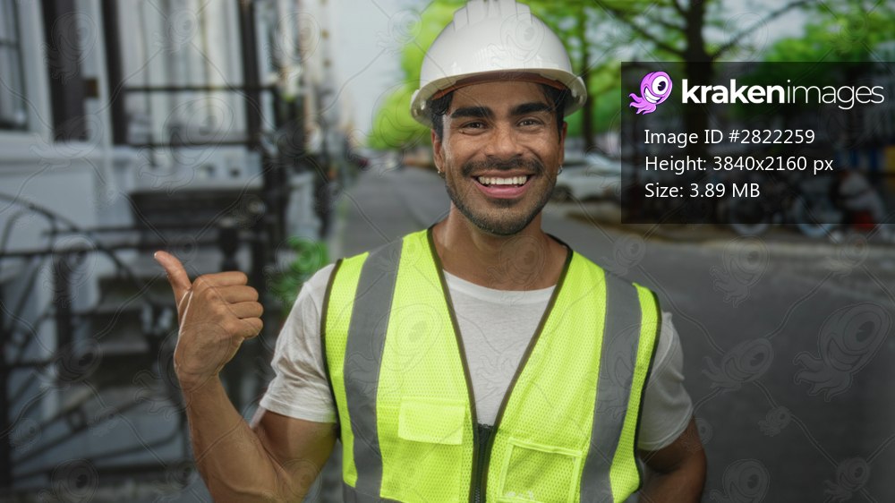 Man in hardhat and reflective vest gives thumbs up on urban street lined with bicycles; optimism ambition success.