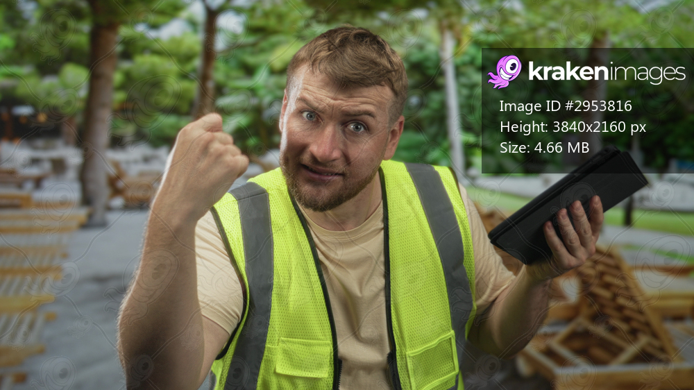 Man in high visibility vest holding tablet raises hands palms up in forest park with benches and trees; confusion and uncertainty.