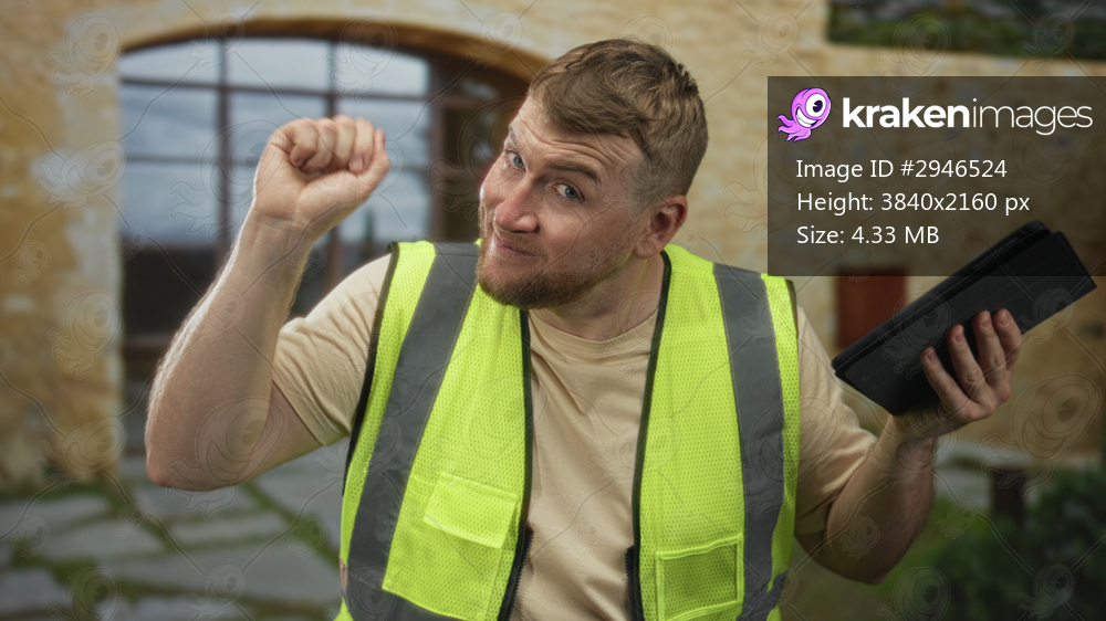 Man in high visibility vest shrugging with palms up at building entrance holding tablet; uncertainty work delay.