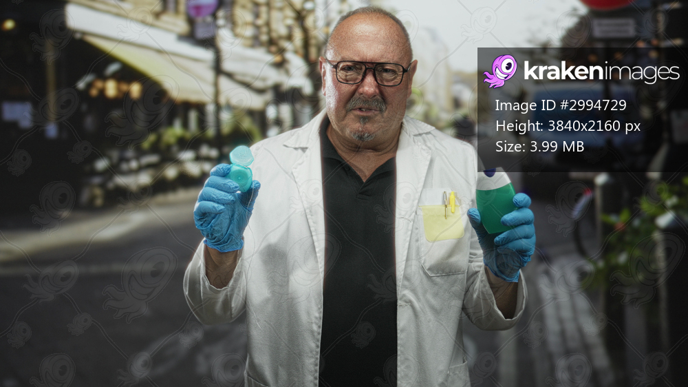 Man in lab coat holds dental floss container and toothpaste with gloved hands on street cafe; oral hygiene concern.