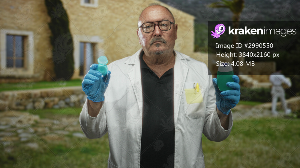 Man in lab coat holds toothpaste bottle and dental floss with gloved hands in front of stone building; serious instruction.