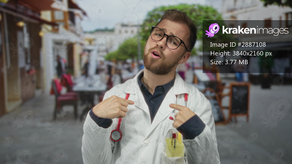 Man in labcoat with stethoscope pointing to chest on a street cafe terrace with chalkboard and tables; confidence friendliness.