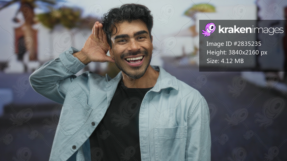 Man in light blue shirt cups ear on sunlit street lined with whitewashed walls, leaning forward in attentive pose; curiosity.