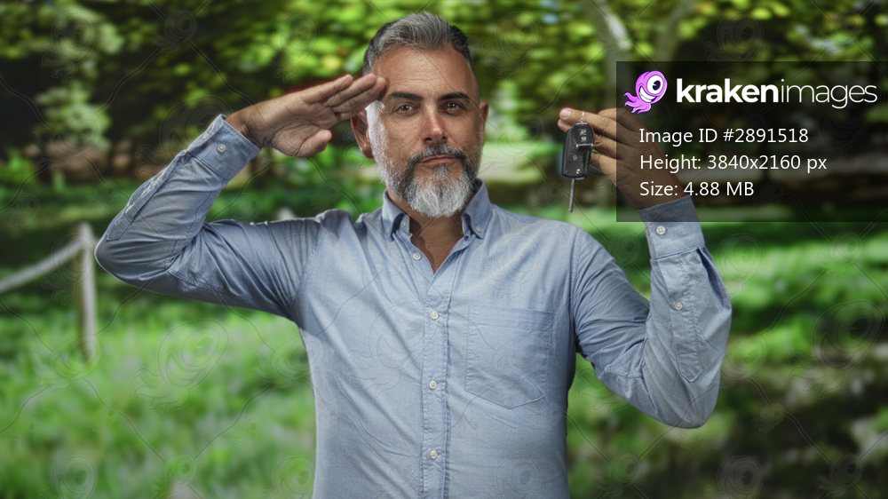 Man in light blue shirt holding car keys with hand to forehead salute in green forest beside a rope path; pride ownership.