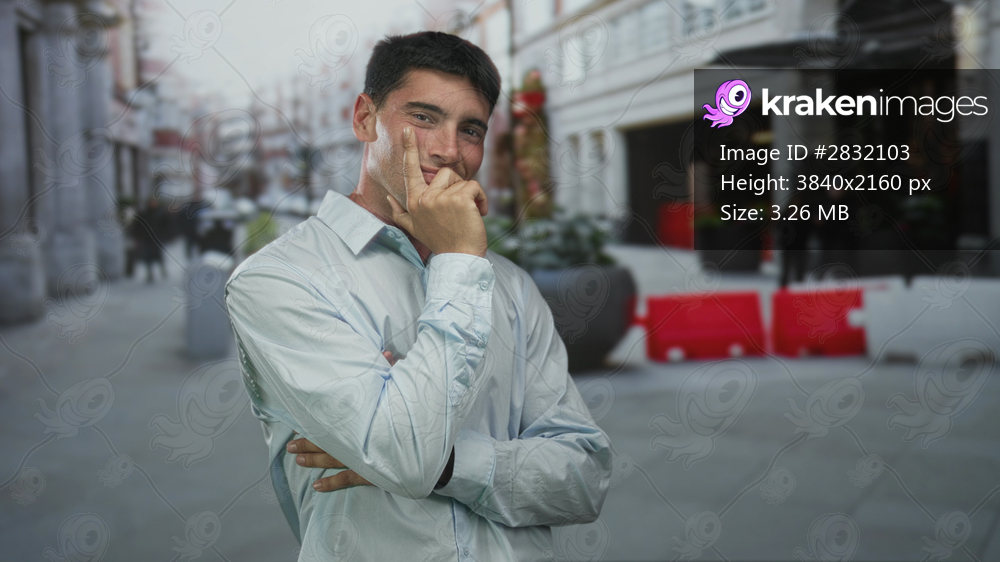 Man in light blue shirt holding his right hand to his chin while standing on a city street; contemplation.