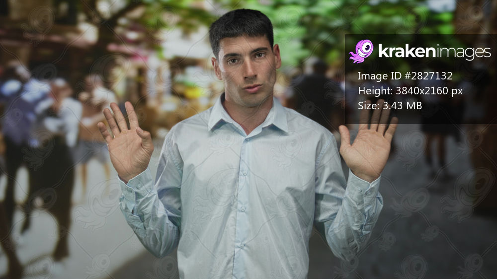 Man in light blue shirt raises both hands with palms forward in busy city street under canopy of trees; surrender.