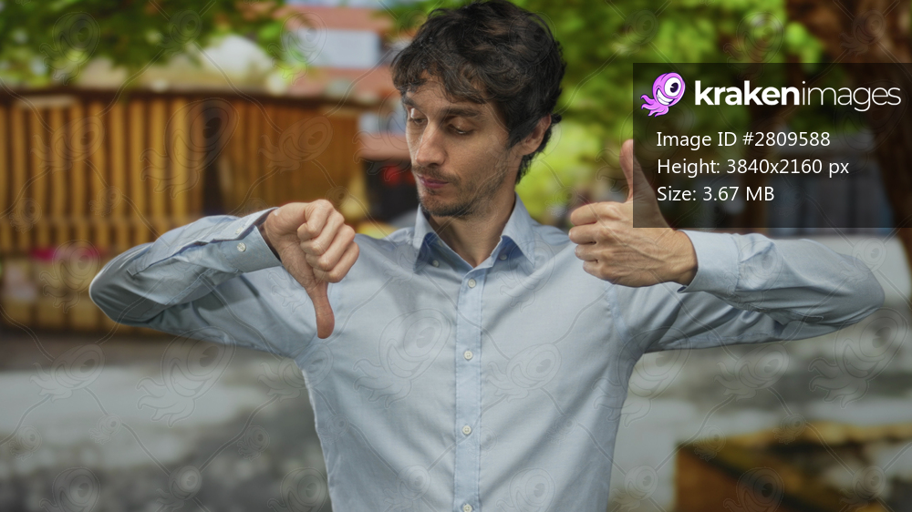 Man in light blue shirt smiles while holding left thumb down and right thumb up in a green park; indecision.