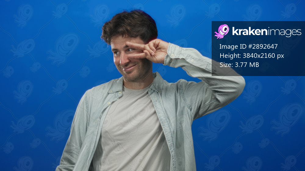 Man in light denim shirt flashing two finger peace sign by eye in studio against vivid blue backdrop; playful confidence.