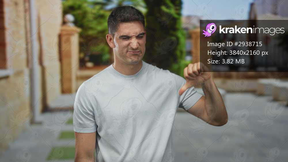Man in light gray t shirt points finger upward and then shows a thumbs down while standing on a stone street beside a building and trees; disapproval.