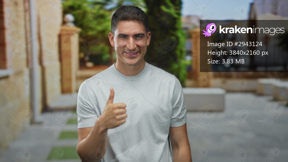 Man in light gray t shirt points finger upward and then shows a thumbs down while standing on a stone street beside a building and trees; disapproval.