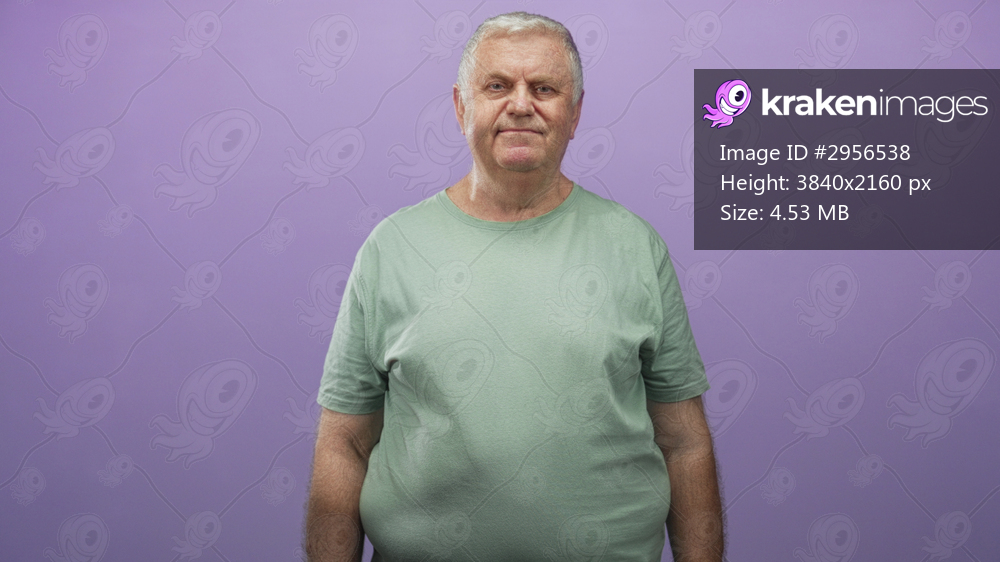 Man in light green tshirt with face shifting from closed eyes to gentle smile, arms relaxed at sides, standing against a purple studio wall; quiet contentment. - Kraken Images