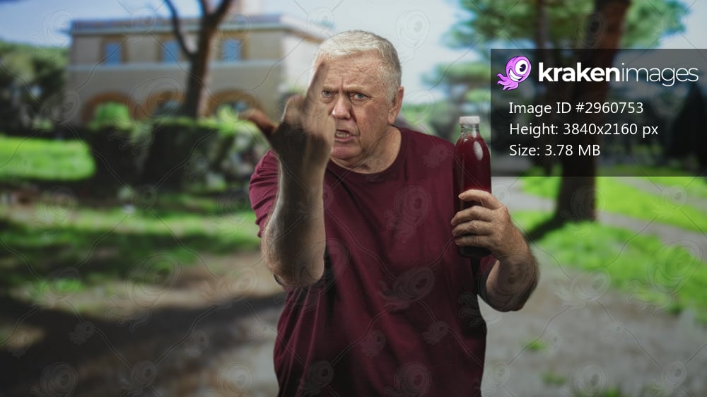 Man in maroon shirt holding a pomegranate juice bottle gestures with middle finger on a sunny building path lined with trees and hedges; defiance.