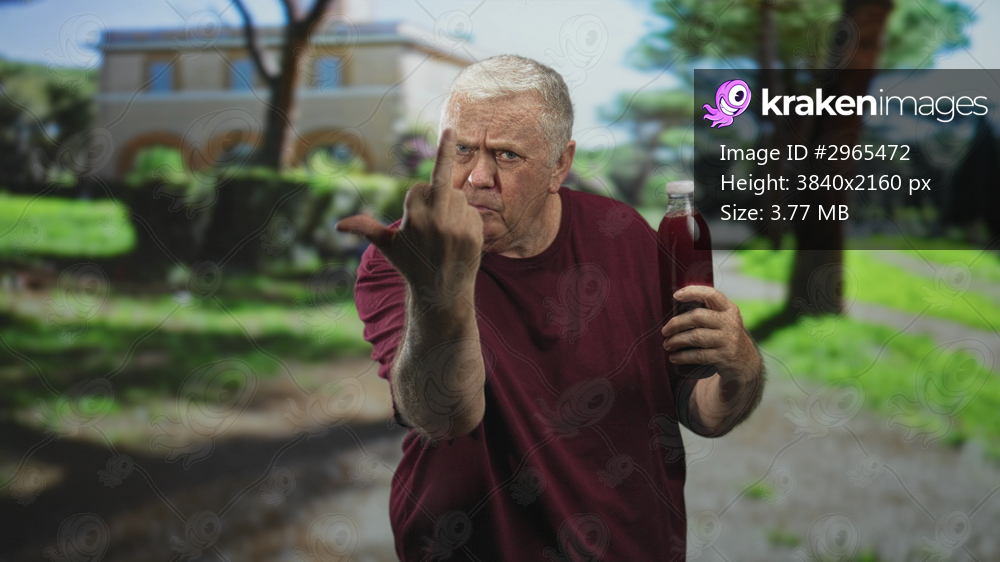 Man in maroon shirt holding a pomegranate juice bottle gestures with middle finger on a sunny building path lined with trees and hedges; defiance.