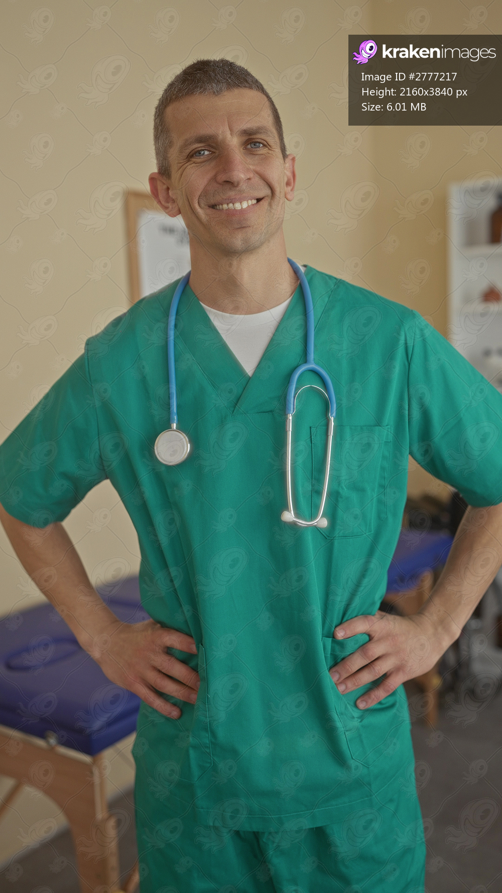 Man in medical uniform with a stethoscope smiling confidently in a hospital room, conveying warmth and professionalism in a clinical setting.