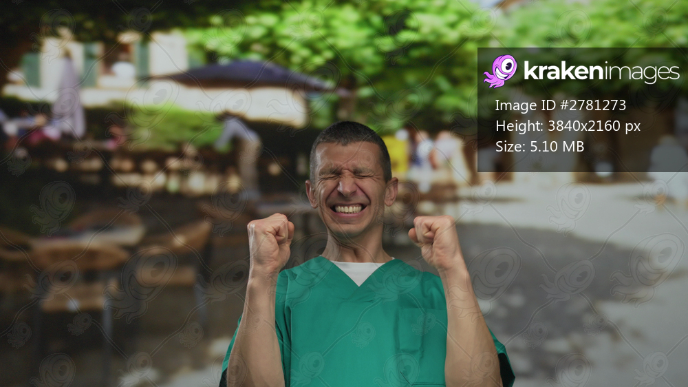 Man in medical uniform celebrates joyfully outdoors on a sunny street filled with people and greenery, fists clenched in happiness and satisfaction.