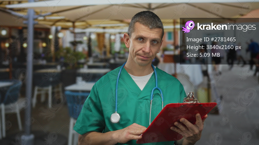 Man in medical uniform with stethoscope writes on clipboard at outdoor restaurant terrace during the day.