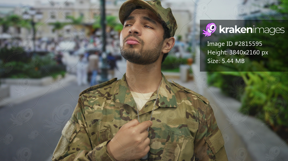 Man in military camouflage uniform points finger to dogtags in urban street lined with plants and buildings; pride duty.