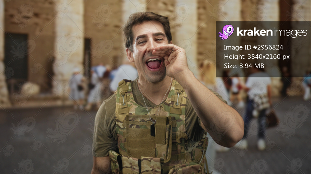 Man in military vest cups hands to shout in busy street near ancient stone columns surrounded by tourists; pride duty.