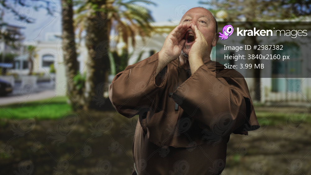 Man in monk robe wearing a cross necklace, hands cupped to mouth shouting and raising a fist near face in front of building with palm trees and grass; devotion prayer call. - Kraken Images