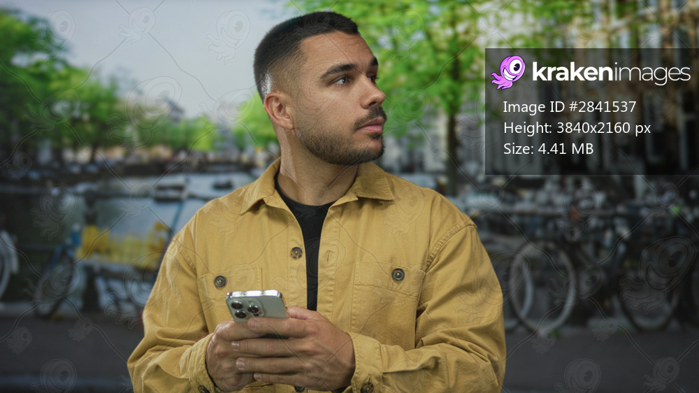 Man in mustard jacket holds smartphone and scrolls screen on street beside canal with parked bicycles and brick buildings; quiet reflection.