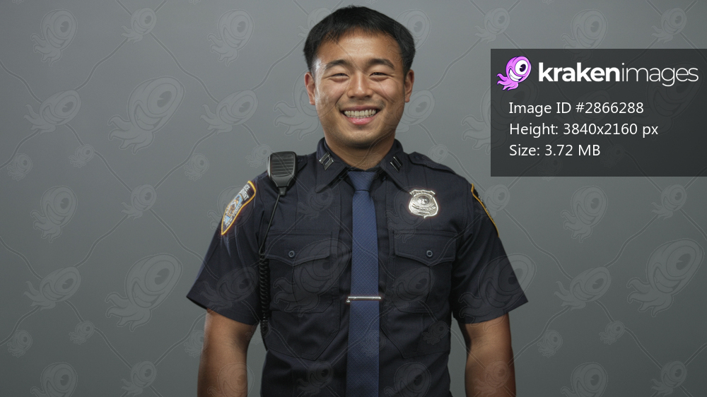 Man in navy blue uniform with badge and tie smiling directly at camera in grey studio; duty pride confidence.