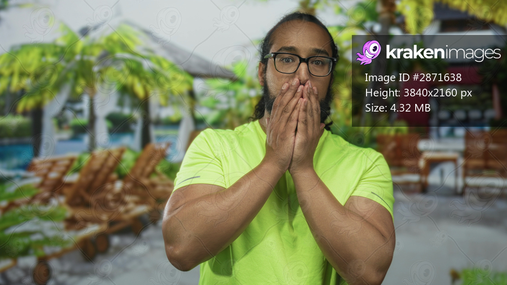 Man in neon green shirt covering mouth with hands at building poolside resort cabana near wooden lounge chairs and palm trees; surprise vacation.