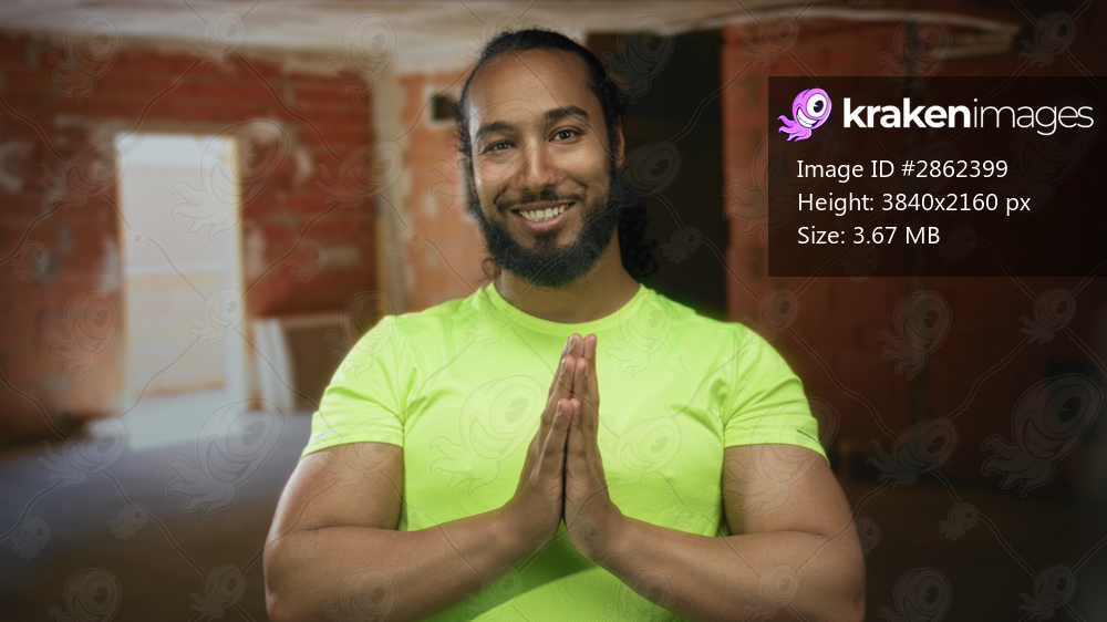 Man in neon green shirt with hands pressed together in prayer, eyes closed, beard visible, standing in a building under construction; serenity gratitude. - Kraken Images