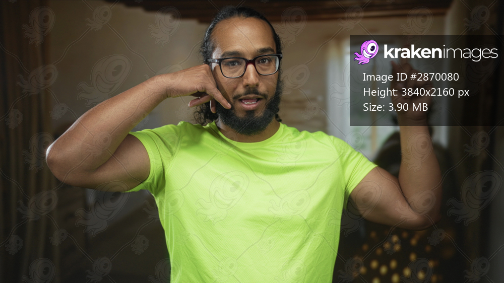 Man in neon green shirt makes a phone call gesture with hand and points finger upward inside a building, framed in a living room; playful connection.