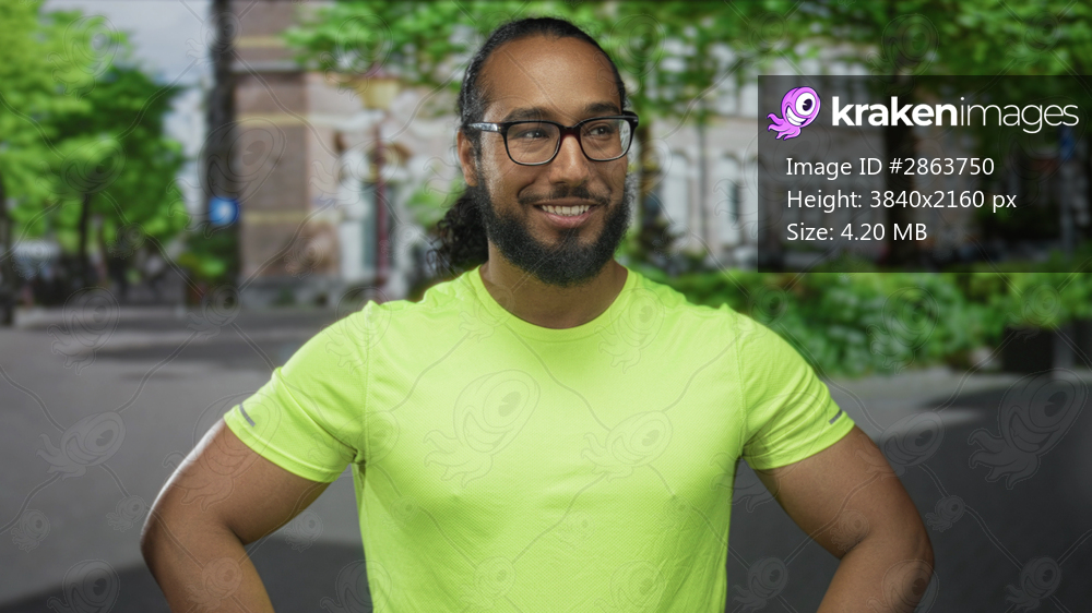 Man in neon green shirt smiling with hands on hips on city street in front of building, glasses and beard visible; confidence wellness fitness.