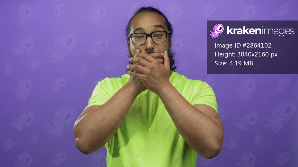 Man in neon green shirt wearing glasses covering mouth with hands in purple studio; surprise candid gesture.