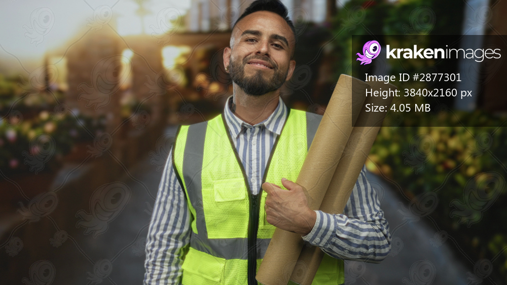 Man in neon safety vest holding rolled plans and makes ok sign on street near building and plants; confidence reliability expertise.