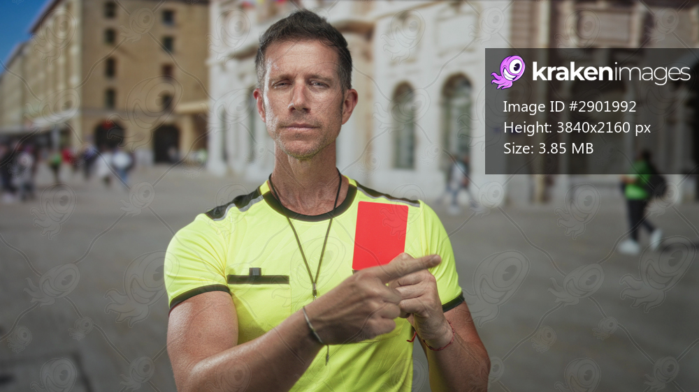 Man in neon yellow shirt holds red card and whistle on lanyard, points finger to camera in building plaza with blurred pedestrians; discipline.