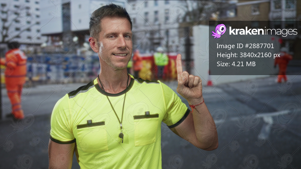 Man in neon yellow shirt with whistle points index finger on street at construction site; safety confidence.