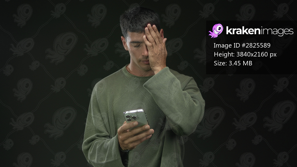 Man in olive green sweater holding silver smartphone in studio with dark green background and covering face with hand while frowning; worry.