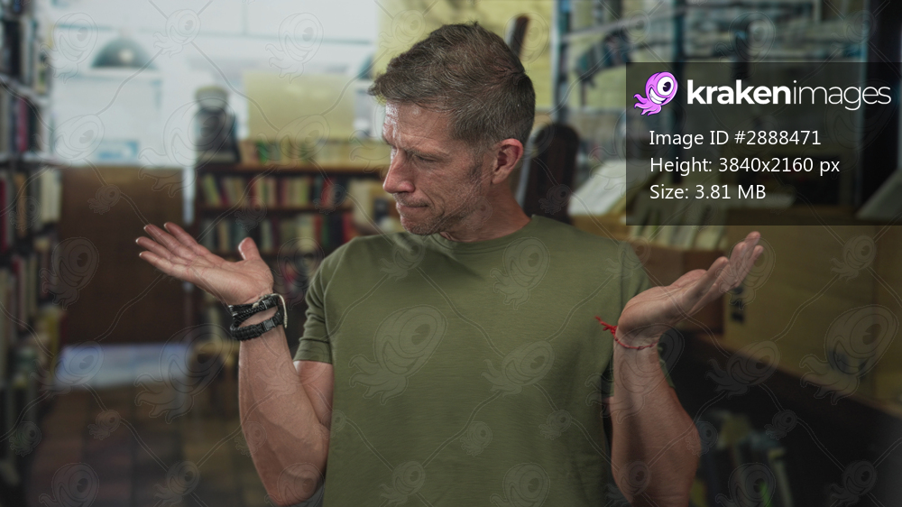 Man in olive t shirt shrugs with palms up and forearms visible among books and shelves in a library building; uncertainty.