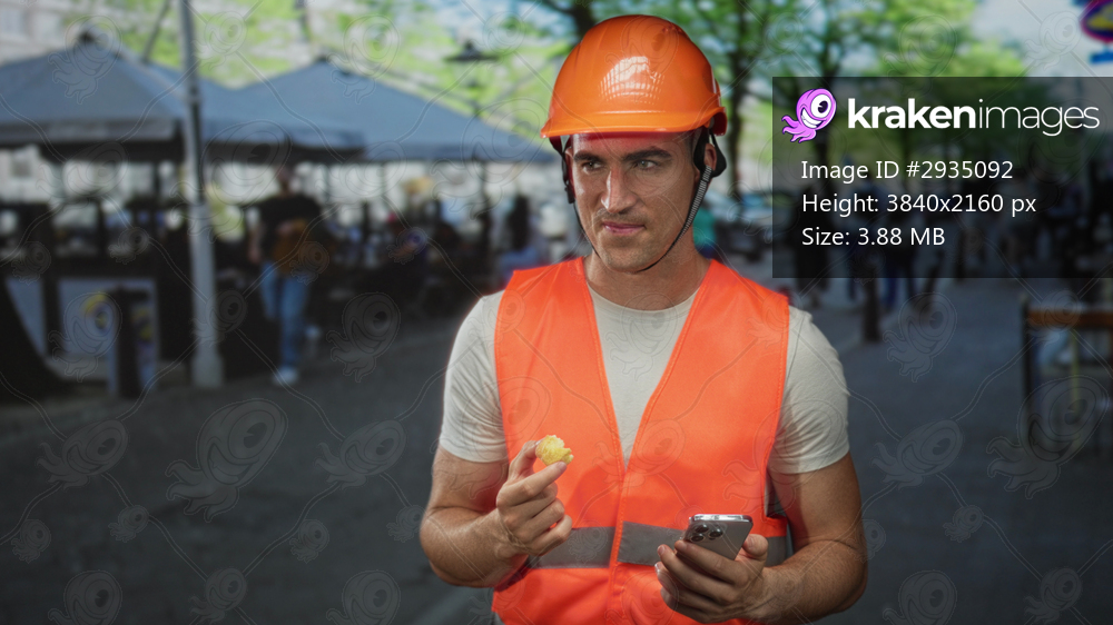 Man in orange hardhat and high visibility vest holding smartphone and pastry on street terrace; work break focus.