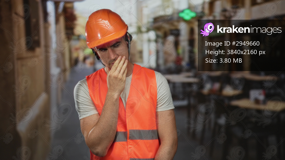 Man in orange hardhat and reflective safety vest with hand on chin on street terrace outside restaurant; quiet contemplation.