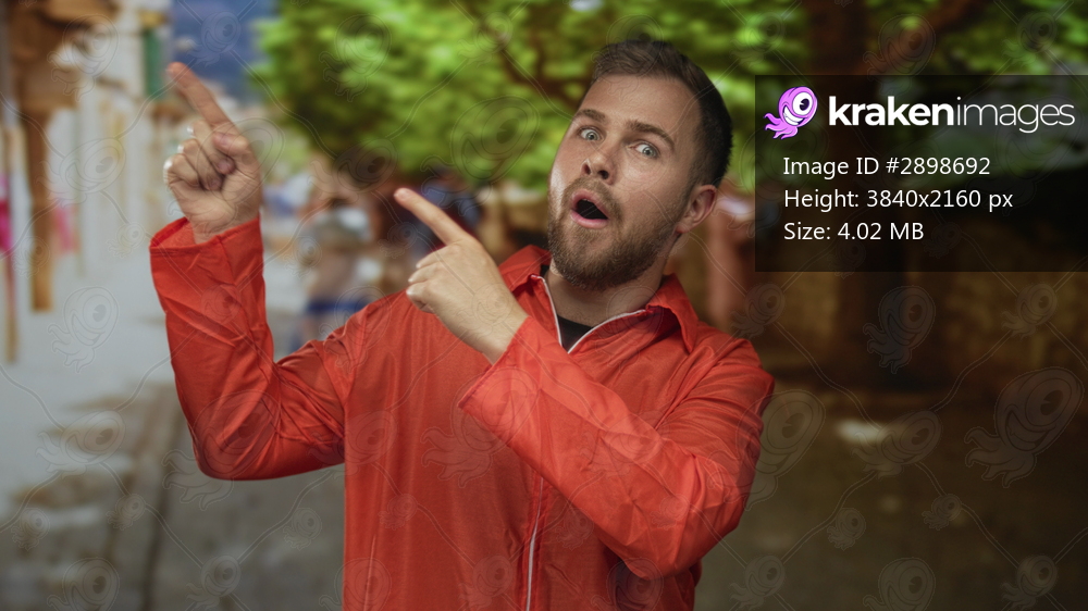 Man in orange jacket points finger upward on a tree lined street, mouth open and hands gesturing, blurred pedestrians behind him; surprise.