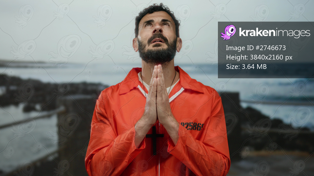 Man in orange jumpsuit praying on a beach with ocean waves hitting the shore in the background under a cloudy sky, wearing a black cross necklace and looking upwards thoughtfully. - Kraken Images