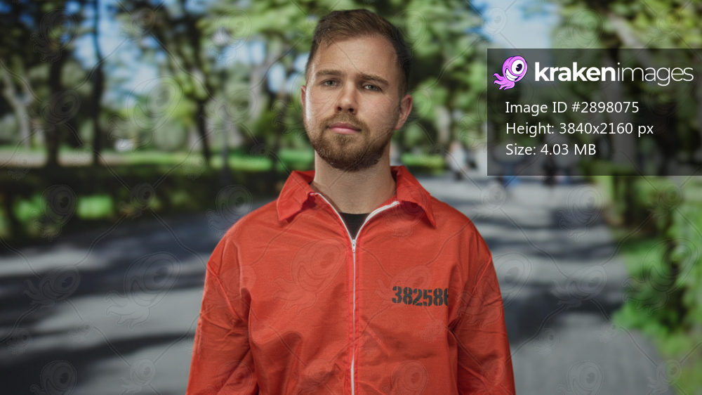 Man in orange prison jumpsuit with number 382586 standing and looking at camera on a tree lined park path; solitude.