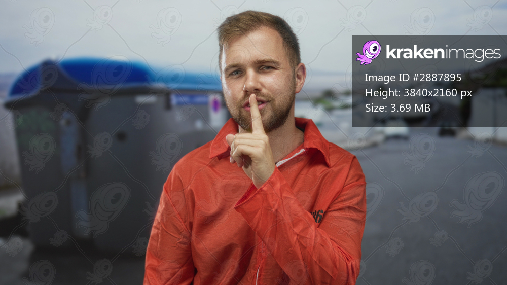 Man in orange prisoner jumpsuit with finger to lips for silence next to recycling container on street outdoors; secrecy.