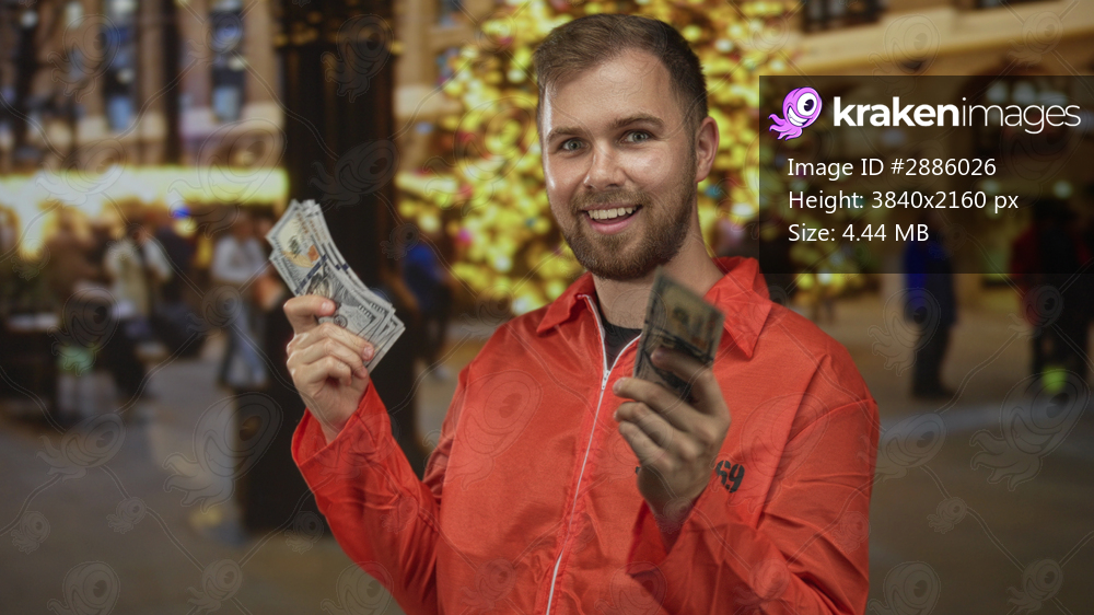 Man in orange prisoner jumpsuit holding stacks of cash with hands on a street with holiday lights and tree; holiday mischief.