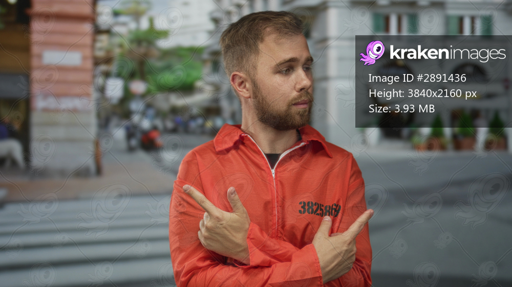 Man in orange prisoner jumpsuit with visible inmate number points finger and crosses arms on busy city street by cafe and crosswalk; urban defiance.