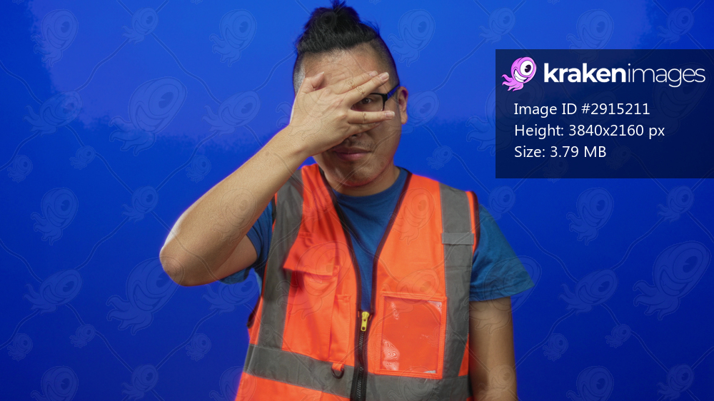 Man in orange reflective safety vest covers one eye with hand while facing camera in blue studio; embarrassment.