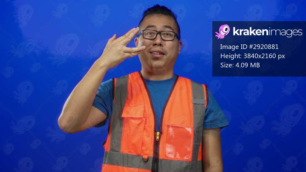 Man in orange reflective safety vest covers one eye with hand while facing camera in blue studio; embarrassment.