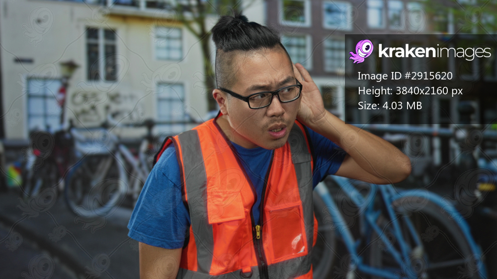 Man in orange reflective vest gives thumbs up on a street in amsterdam beside bicycles and canal buildings; friendly service.