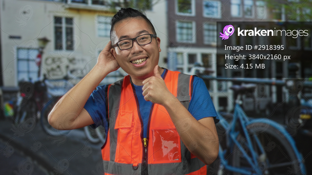 Man in orange reflective vest gives thumbs up on a street in amsterdam beside bicycles and canal buildings; friendly service.