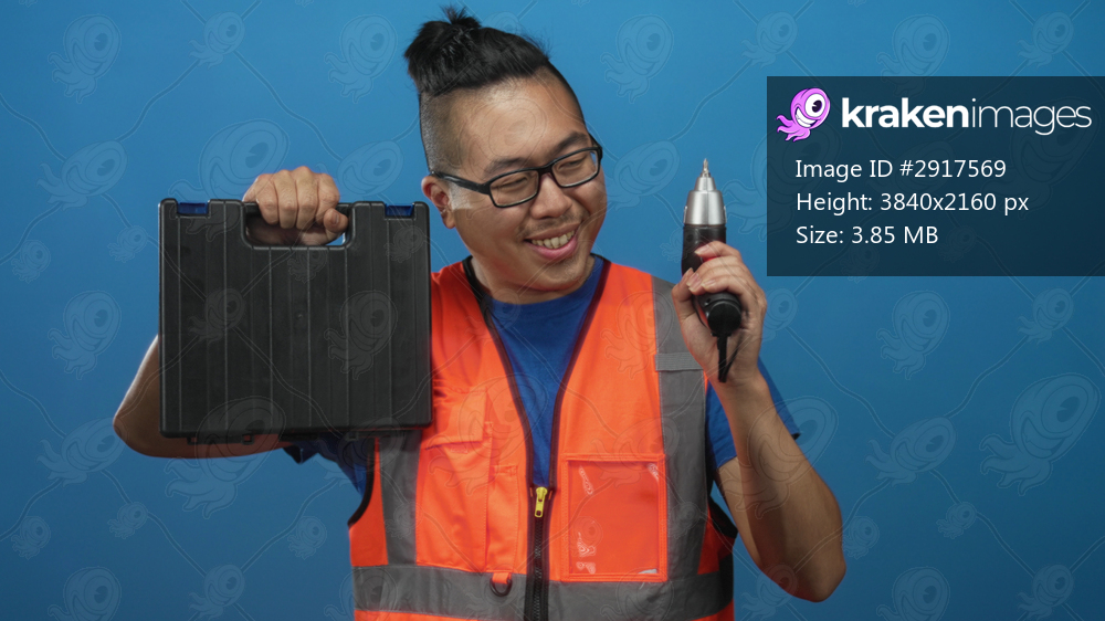 Man in orange reflective vest holding a black toolbox and power drill, smiling and raising the case in blue studio; confidence craftsmanship repair.