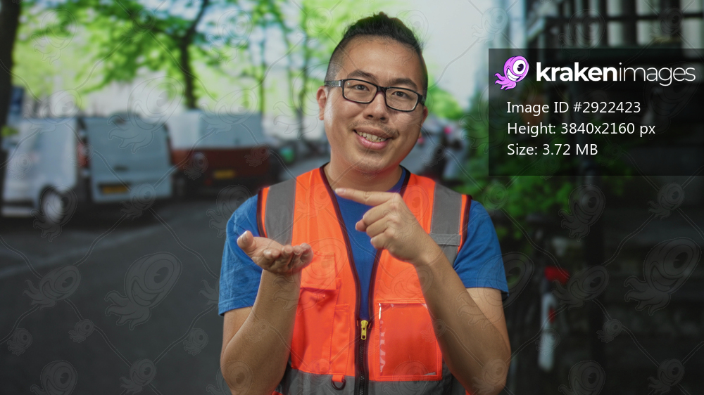 Man in orange reflective vest pointing finger to open palm on a street with parked vans and greenery; confidence service.